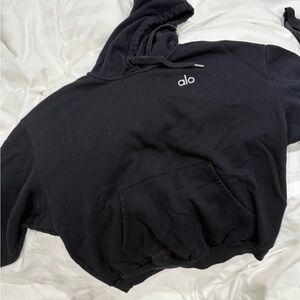 Cozy black hoodie with ALO logo. Perfect for casual wear.