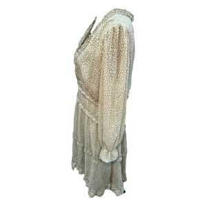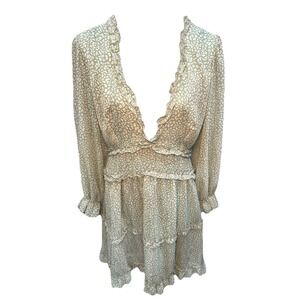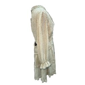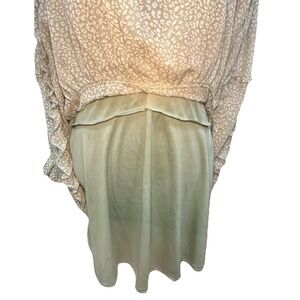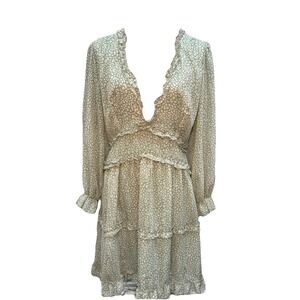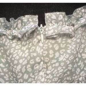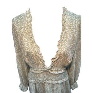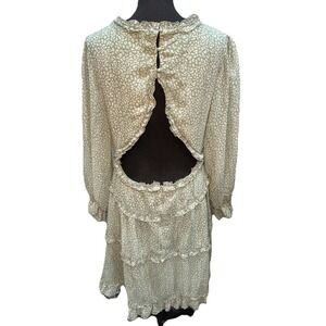 Sundress Women's Dress Large Green Ruffles White Print Open Back Long Sleeves
