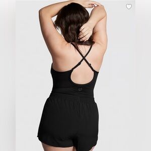 PINK Ultimate Runsie athletic romper features built in shorts, adjustable straps and removable pads