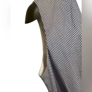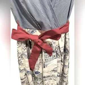 • Features a blue and white striped V- Neck Bodice Accented with a bold red tie sash at the Waist
