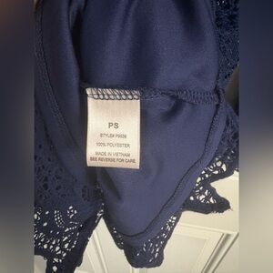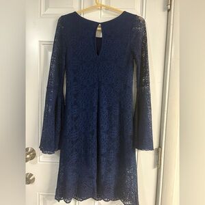 Chic navy dress with intricate lace. Long sleeves for elegant style. Perfect for special occasions.