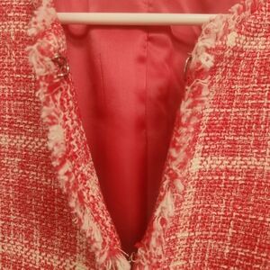 Chic tweed blazer with pink and white checkered design. Round neckline with fringe details. Hook and Eye Closures.