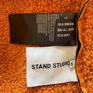 The Stand Studio Lilli Black Leather Jacket is a stylish and versatile piece perfect for the colder seasons. Featuring a faux fir lining and trim, this short bomber jacket offers a cozy and fashionable look. The long sleeves, button closure, and size 40 make it ideal for casual occasions, while the polyester lining and insulation ensure warmth. This jacket from STAND STUDIO is a must-have for anyone's wardrobe, combining high-quality materials and on-trend design. It measures 23" from pit to pit and 27" from collar to hem. Excellent condition as shown in the photos.