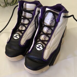 Stylish high-top sneakers in black and white with purple accents. Perfect for casual wear.