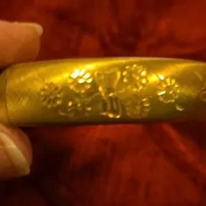 Vintage or antique 1/20th 14 karat gold filled hinged bangle bracelet. Decorated with flowers, the bracelet is a satin finish. In good vintage condition, no dents or major scratches. Clasping mechanism works well.