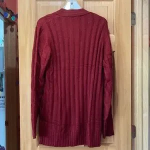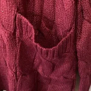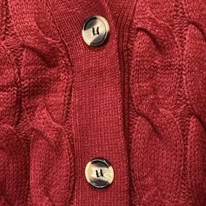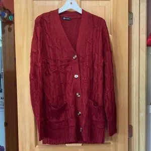 Stay cozy and stylish with this dark red cable knit cardigan sweater. Perfect for layering, this sweater adds a touch of warmth and elegance to any outfit. Has pockets and lovely big buttons