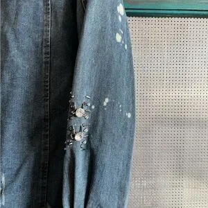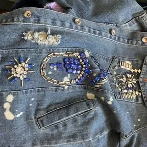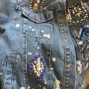 This chic denim jacket features intricate embroidery and a stylish fringe hem. Perfect for adding a unique flair to any outfit. Covered with Swarovski Crystals and distressing.