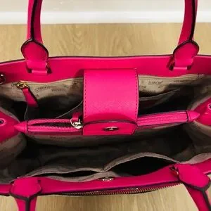 Stylish Michael Kors tote with vibrant pink accents. Features signature MK pattern. Perfect for everyday use.