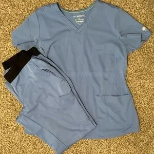 Comfortable blue scrub set with top and pants. Ideal for healthcare professionals.