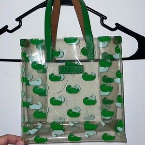 Stylish transparent tote bag with green accents, perfect for everyday use. Features a unique design for a modern look.