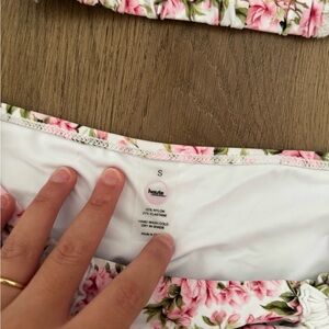 Chic floral bikini set with a matching wrap. Features pink and white floral patterns.