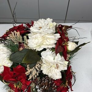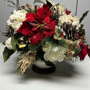 Holiday Centerpiece Floral, Poinsettias, Pinecones , Cardinals