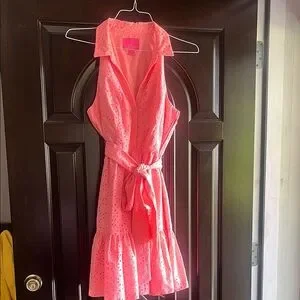 Chic pink sleeveless dress with eyelet design. Features a stylish tie waist.