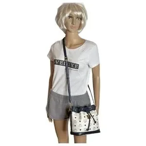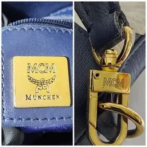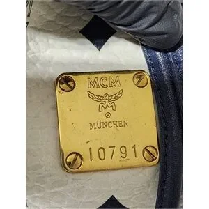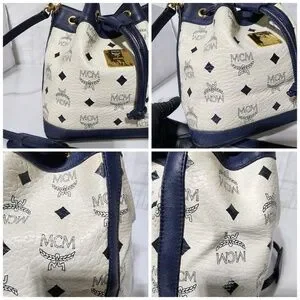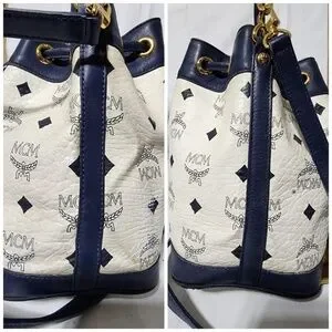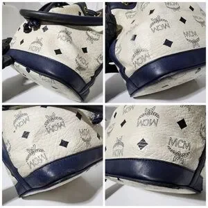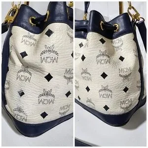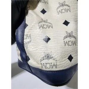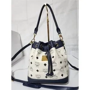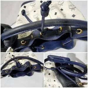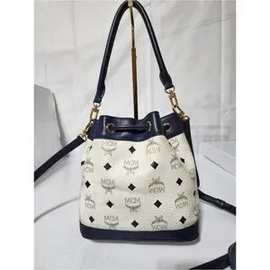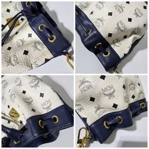 Authentic MCM 2way Visetos Small Drawstring Shoulder Bag White/Navy Blue