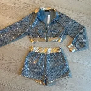 This Denim gold sequin jacket and shorts set is a stylish and eye-catching outfit for women. The denim fabric with gold sequin accents adds a touch of glam to the set, making it perfect for a night out. The zip closure maintains a trendy and modern look, while the small size ensures a flattering fit. Perfect for those looking to make a statement with their fashion choices.