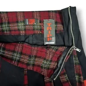 Vintage Tripp NYC Skirt Womens Mini Gothic Plaid Zippers Pleated Punk Grunge. Black pleated mini skirt with red plaid accents and a metal zipper and buckle detail. Brand new with tags. The zipper works great.