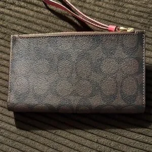 Elegant Coach wristlet in brown and magenta. Features iconic pattern and logo detail.