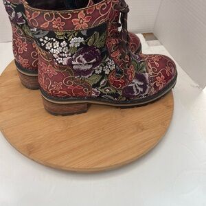Incredible leather combination bootie showing an embroidered textile and embossed floral leather on a comfort lug sole.
