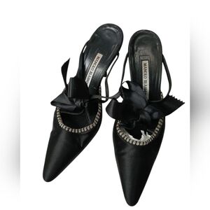 Authentic MANOLO BLAHNIK Black Satin Mules w/Bow Vamp Size 37
