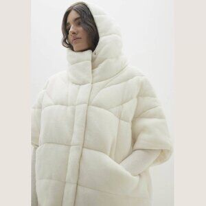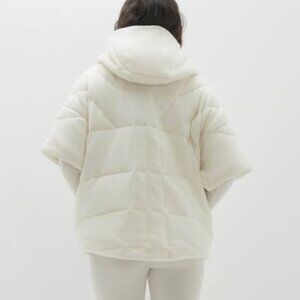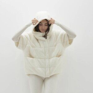The Patti Cashmere Puffer Jacket redefines winter outerwear with its unique short sleeves and combination of zip-up and snap button closures. A hood and slit pockets offer extra warmth and functionality.