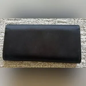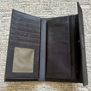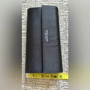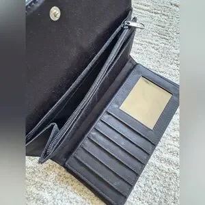 Approximately 8” x 4” Has card pockets including one for an ID and a zipper pocket Good condition, gently used