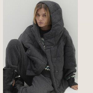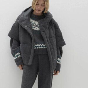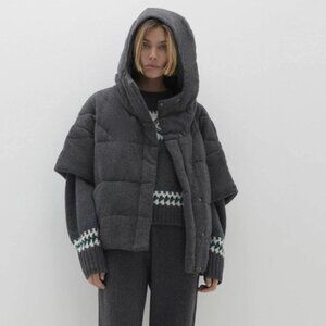 The Patti Cashmere Puffer Jacket redefines winter outerwear with its unique short sleeves and combination of zip-up and snap button closures. A hood and slit pockets offer extra warmth and functionality.