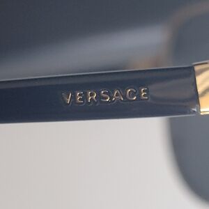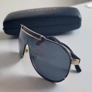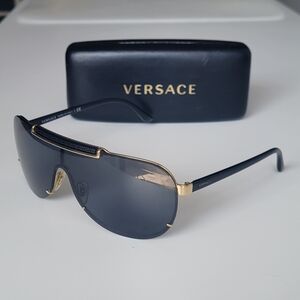 Stylish Versace sunglasses with black lenses and gold accents. Perfect for a chic look.