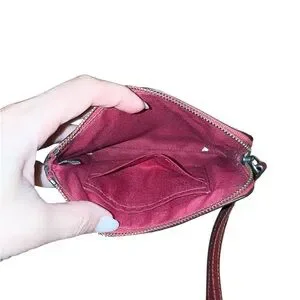 Chic and compact Coach wristlet. Shimmering red finish. Ideal for essentials. Sold as is!