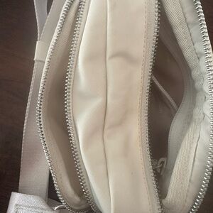 Lululemon crossbody bag in cream. Features adjustable strap and 2 secure closures with spaces for cards and other smaller items inside. Also has an outside pocket perfect for a phone
