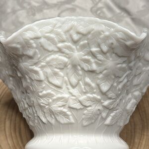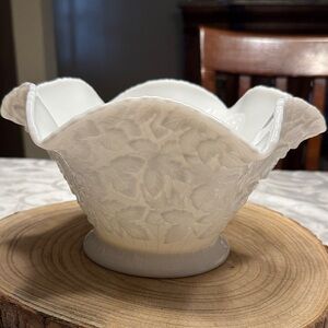 This is a preowned , early 20th century, Westmoreland milk glass fruit bowl with raised maple leaf design. Sometimes referred to as Bramble. ruffled edge. It measures 5 1/2” tall & 10” wide at its widest point. It is in mint condition.