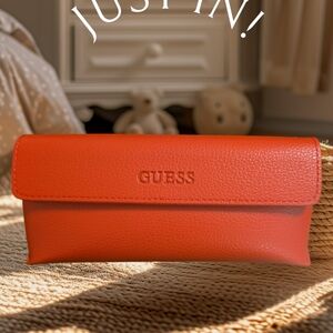 Stylish Guess sunglasses with vibrant orange lenses. Features bold yellow arms. Includes matching orange case.