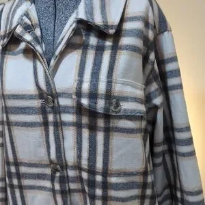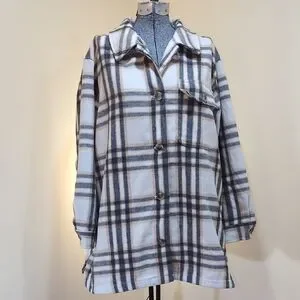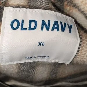 Chic plaid utility shacket by Old Navy. Features a cream and blue pattern. Ideal for layering.