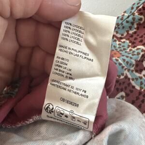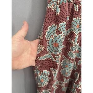 The Anthropologie Jumpsuit in Mauve is a stylish and versatile piece perfect for both parties and casual occasions. This one-piece outfit features a flattering V-neckline, short sleeves, and a comfortable pullover closure. Made from 100% TENCEL™ lyocell fabric, this jumpsuit is machine washable and has an elastic waist for a comfortable fit. The wide leg design and floral pattern add a touch of bohemian and colorful flair, making it a standout choice for the summer, fall, and spring seasons. Perfect for those looking for a comfortable and fashionable option.