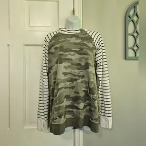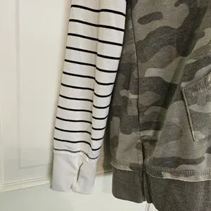 Stylish camouflage body with striped sleeves. Comfortable and trendy design. Perfect for casual wear.