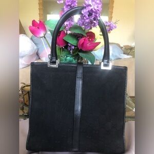 Vintage Gucci Elegant small Black leather&fabric Tote Bag silver color details