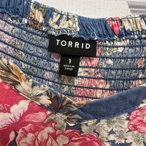 Vibrant Torrid dress with floral design. Features pink and cream flowers on a blue background. Ideal for casual outings.