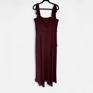 Love Me Forever Burgundy Tie-Strap Square Neck Maxi Dress takes you on a romantic night out! Woven chiffon shapes this chic dress that has wide straps, that tie together at the shoulders, and a square neckline. The princess-seamed bodice tops a flowy maxi skirt with a thigh-high slit at the front. Hidden back zipper/clasp.