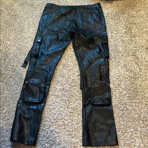 Chic black faux leather pants with a sleek design. Perfect for a modern look.