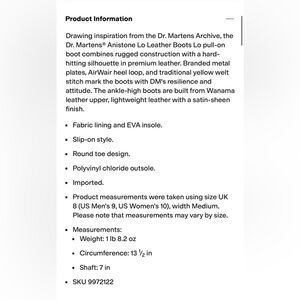 Drawing inspiration from the Dr. Martens Archive, the Dr. Martens® Anistone Lo Leather Boots Lo pull-on boot combines rugged construction with a hard-hitting silhouette in premium leather. Branded metal plates, AirWair heel loop, and traditional yellow welt stitch mark the boots with DM's resilience and attitude. The ankle-high boots are built from Wanama leather upper, lightweight leather with a satin-sheen finish.