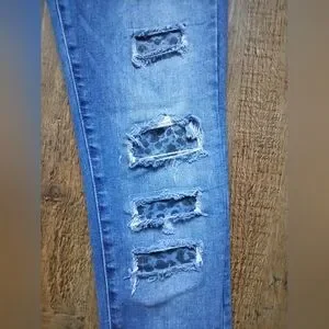 Trendy distressed skinny jeans with leopard print patches. Comfortable fit. Perfect for casual wear.