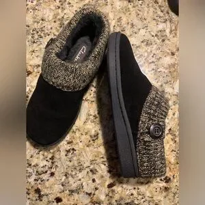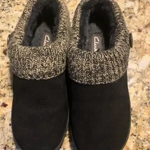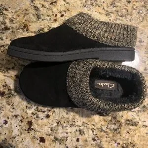 ❎SOLD❎ Clark’s Black and Tan Knit Faux Fur Lined Mules Slippers Women’s Size 9