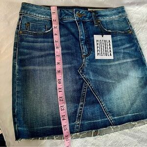 Stylish denim mini skirt by Pistola. Features a front seam detail. Frayed hem for a trendy look.