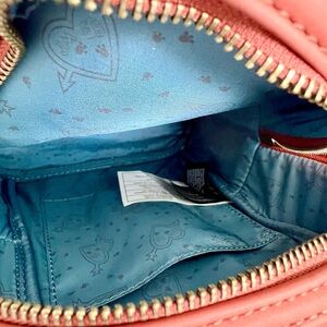 This beautiful bag features beautifully rendered versions of Lady and her love, the Tramp, with moveable ears on Lady! The top half of the bag is brown a la Lady, the bottom half a silver gray for the Tramp, with robins egg blue adjustable straps and official blue metal Disney Loungefly plaque.