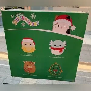 Adorable Squishmallows holiday-themed plush set. Includes four plush toys in festive colors.