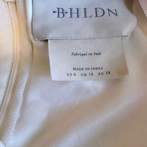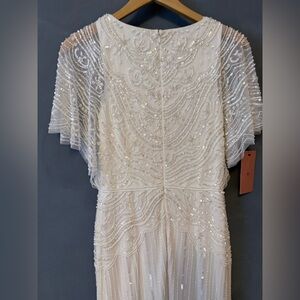 Stunning white dress with intricate beadwork. Features elegant short sleeves and a graceful silhouette. Perfect for weddings.