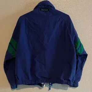 Beige jacket with blue trim. Nautica branding on label. Lightweight and breathable.