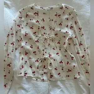 Reformation Cherry Print Tie-Front Blouse - Cream and Red