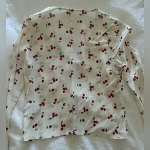 Charming cherry print on a cream blouse. Features a stylish tie-front design. Perfect for casual outings.