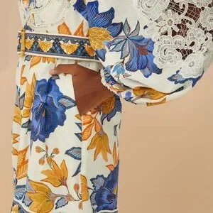 Eye-catching dress featuring vibrant floral patterns in blue and orange. Ideal for a standout look.