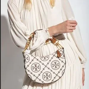 Stylish Tory Burch hobo bag in cream and brown. Features signature logo pattern. Perfect for versatile wear.